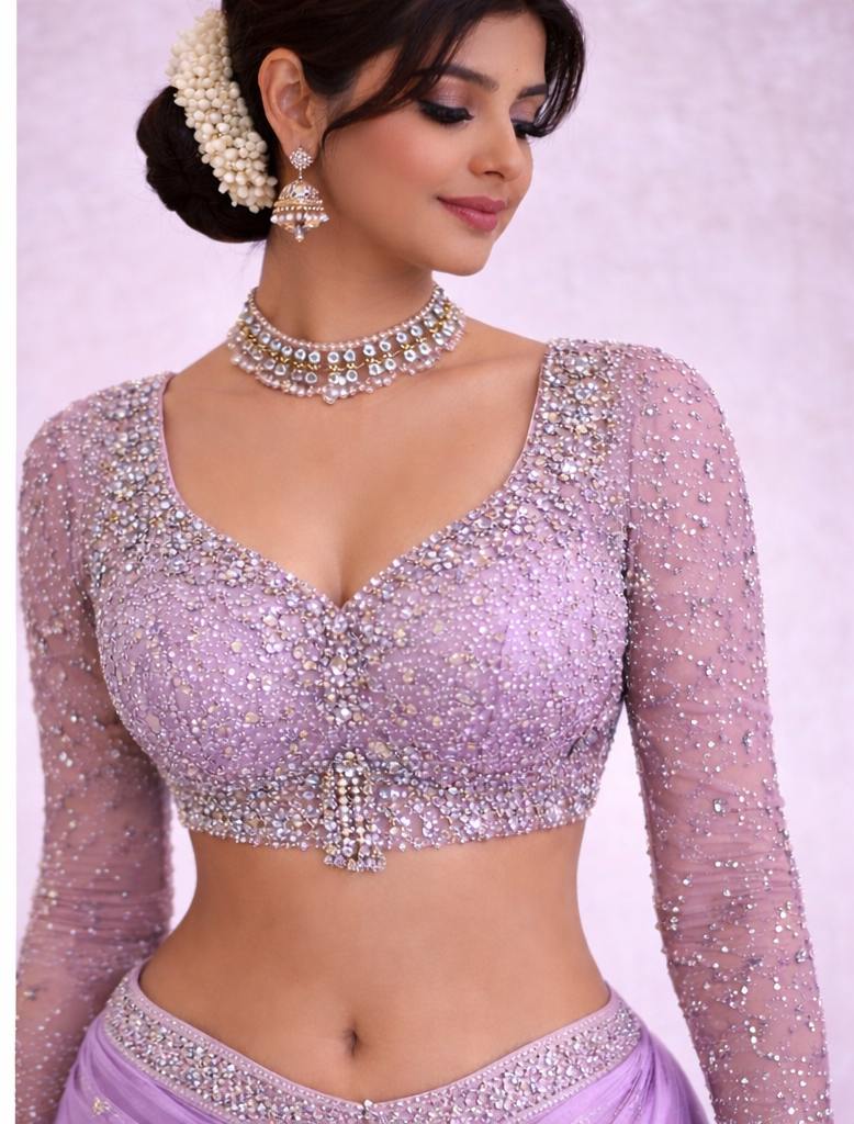 This Lavender Heavy Stone Work Designer Blouse is crafted to give a soft yet luxurious look. Made from a premium net and silk blend fabric, the blouse features dense stone, crystal, and pearl embroidery that adds a rich and elegant finish.