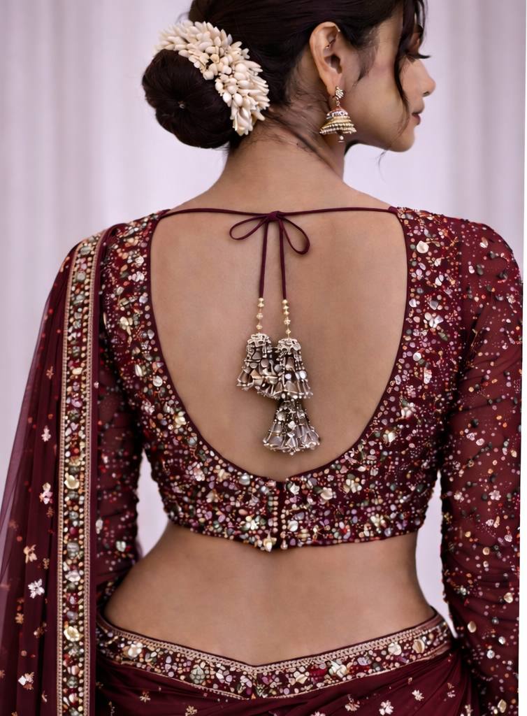 The front is designed with a graceful deep V-neckline, highlighted with intricate stone detailing, while the back showcases a deep U-cut pattern with matching dori tie-up and shimmering stone tassels, enhancing the overall charm. The full sleeves are beautifully embellished, making this blouse ideal for weddings, receptions, engagements, cocktail parties, and festive occasions.